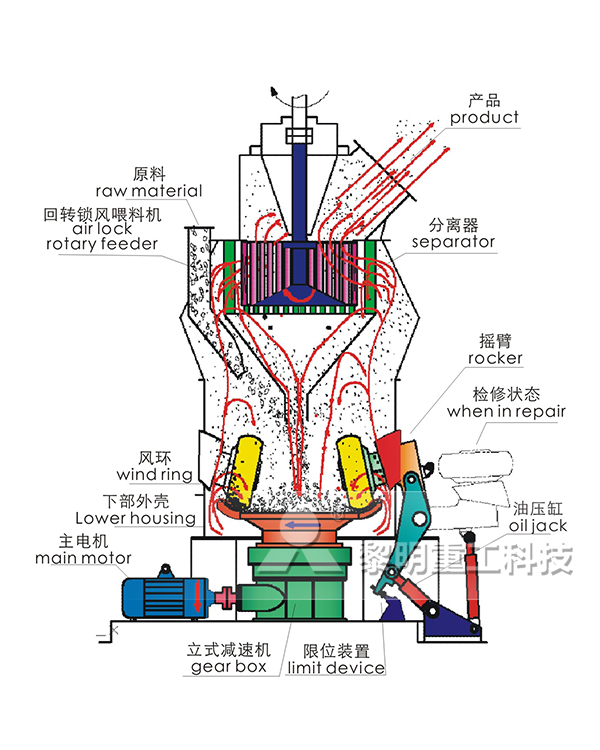 由熱風爐出來的熱風或廢氣,在系統風機的抽引下,進入立式磨煤機,與磨內被粉磨的原煤進行充分熱交換后,帶起煤粉在分離器處進行分選,細度不合格的粗煤粉重新落到磨盤上進行粉磨,合格的煤粉隨氣流進入防爆氣箱脈沖收塵器被收集下來,經過分格輪卸入煤粉倉。 原煤中的雜物,如部分煤矸石、金屬塊等,通過風環、吐渣口排除磨外。