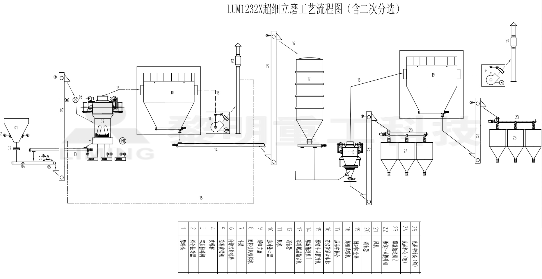 生產該系度范圍的重鈣主要選用超細立磨,LUM系列超細立式磨是黎明重工結合多年的各種磨機研發制造經驗,以LM系列立式磨為基礎,借鑒的德國超細立磨的相關技術,設計開發的科學性粉磨設備,是一種一次完成超細粉磨、分級、輸送于一體的超細制粉行業專用設備,漆工藝參數、機械性能及成品質量等技術指標達到標準水平。該機可直接粉磨生產650目的重鈣,通過增加二次分級裝置,可生產1500目的超細重鈣。該機主要應用于超細碳酸鈣的粉碎加工,一次成品細度d97=400~1500目(8~38um),單機生產能力依機型不同在8~18T/H,其工藝流程圖看圖。