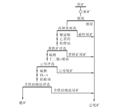 對于長石加工用于陶瓷行業,針對其性質采用破碎-研磨-脫泥-高梯度磁選-浮選流程對其精選。加工工藝流程如圖: