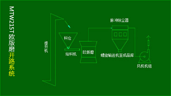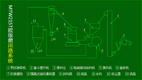 MTW215T歐版磨為立式結構,占地面積小,成套性強。主要由主機、風機、選粉機、專用除塵器、旋風集粉器、管道裝置和電機組成。配套輔助設備包括顎式破碎機、畚斗提升機、電磁振動給料機、料倉、配電柜等。 MTW215T歐版磨為碾壓成粉,是一個密閉的循環系統,在負壓狀態下循環流動。該設備主要部件均采用品質良好鋼材制造,整機耐用可靠,自動化程度高,是目前理想的粉磨設備。